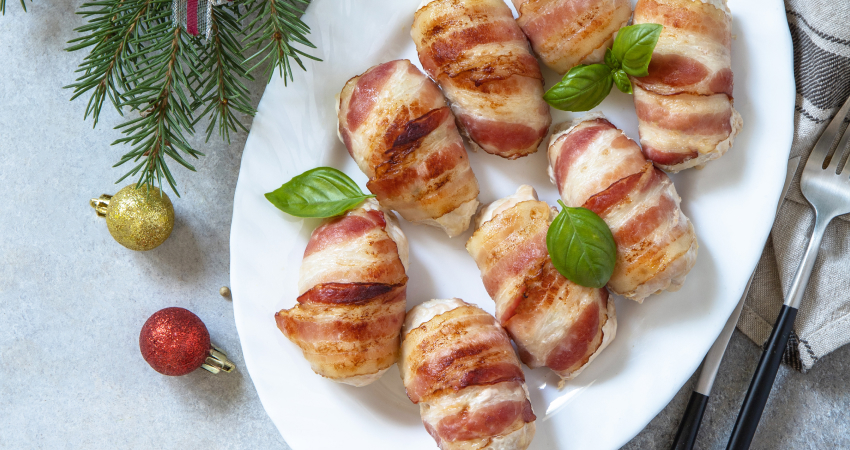 Una opción fácil y rendidora. El tocino envuelve el pollo, manteniéndolo jugoso y lleno de sabor durante la cocción.